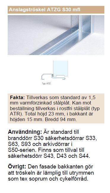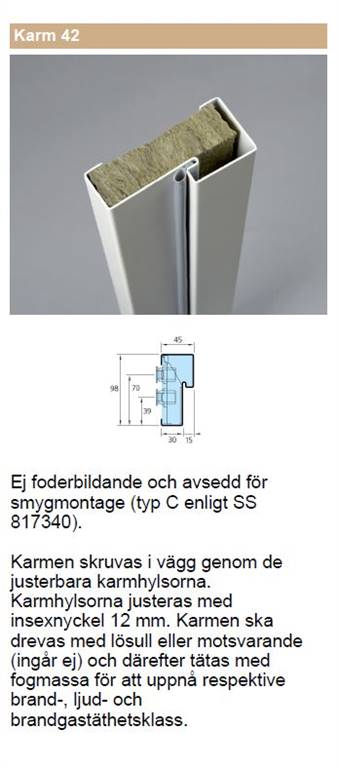 Modell: Ståldörr Y30 Utåtgående: Ja Behandlad: Varmförzinkad dörr för utomhusbruk, CE märkning enligt EN14351-1 Kulör: Dörrblad och karm målas i vald färg. (Kan väljas som laminerad under tillbehör)Dörrblad: 58mm tjockt med fasad överfals av stålplåtDörrbladsisolering: MineralullKarm: Modell 42,inkl tätningslist, Ej foderbildandekarmdjup: 98 mmKarmisolering: ingår ej sätts dit vid monteringKarmhylsor: Förmonterade karmhylsorTröskel: Ståltröskel VZ typ G, ATZGLåshus: Assa 310 A=58mm B=33mmFörberedd för dörrstängare: Assa DC300, Dorma TS83, Geze 4000Brandklass: EI2 30/EW60 (Uppfyller klassning EI30 och EI60)Ljudreduktion: Rw 33 dBLufttäthet: Klass 4 Värmeisolering: U=1,7 Vattentäthet: Klass 7B Vindlast Klass 2BMontagesats: Ingår enkeldörr lätt betong/träregel/stålregelvägg
